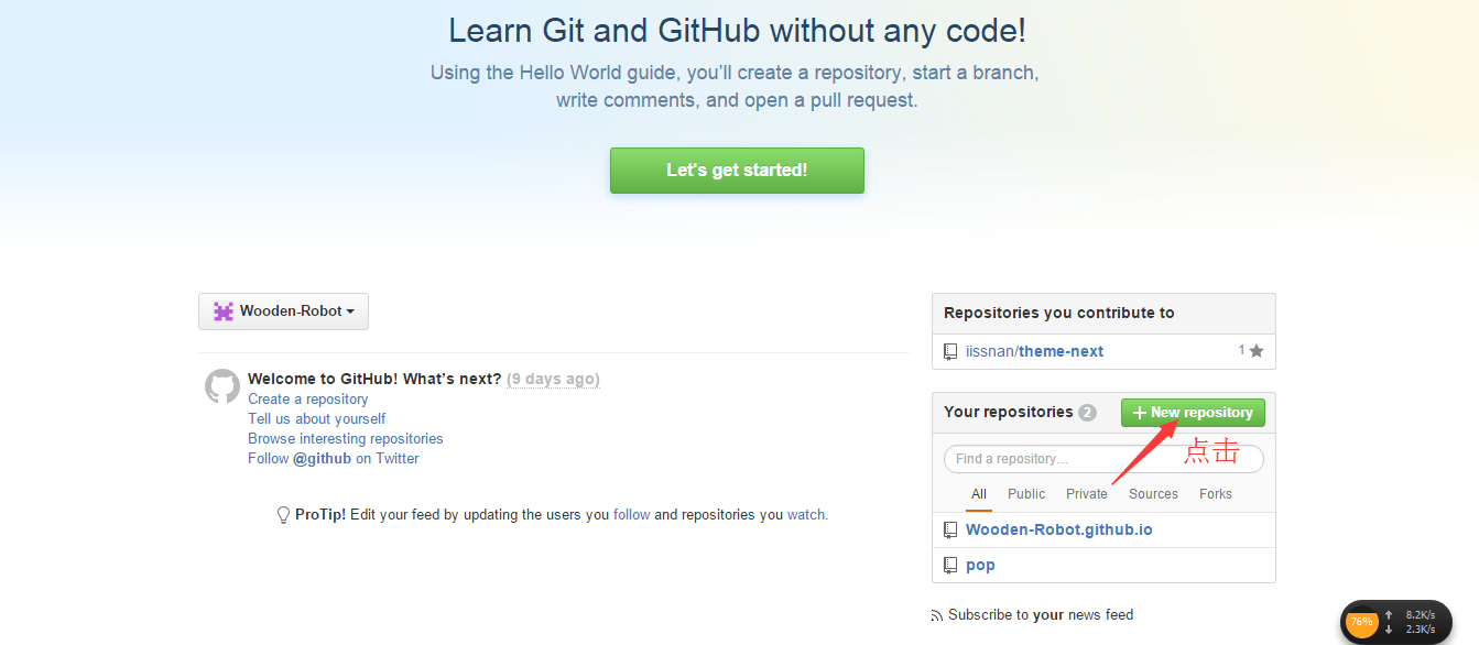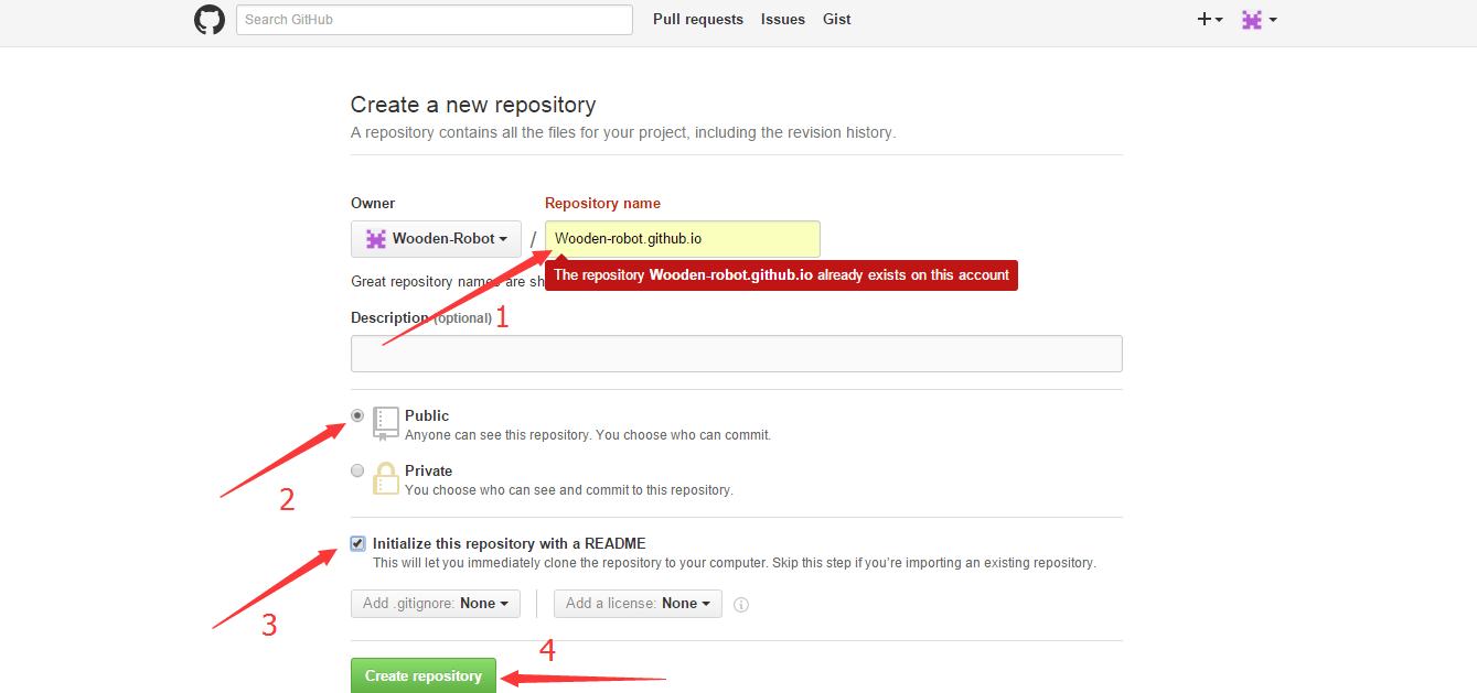 按图中所示操作,其中第一步中填入username.github.io(username是你的账号名,username不区分大小写)。如我的username为Wooden-Robot,我应该填入Wooden-robot.io。