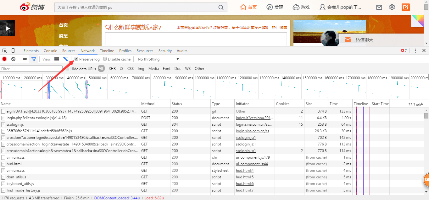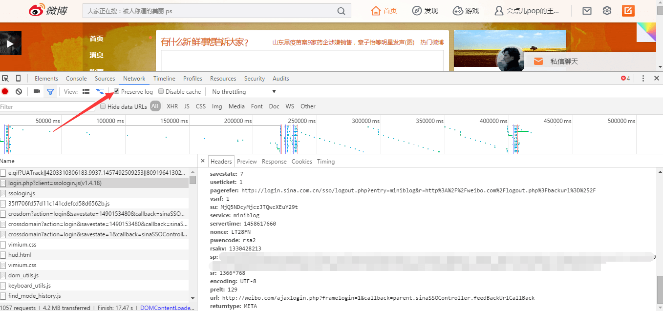 首先我们在Chrome浏览器中打开微博登陆界面,然后Ctrl+shift+i开启开发者工具,在开发者工具的Network选项里找到Preserve log并勾选,然后登录你的微博。之后可以看到以下界面: