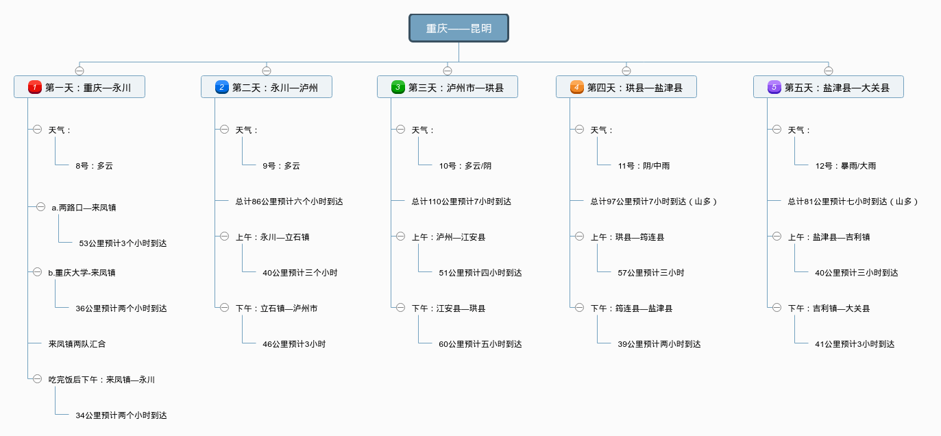 六月底正式离职了,计划了一次小长途骑行(重庆——昆明),定于七月八号出发,前半段路以多云为主,进入云南境内后天气预报多为中雨,希望预报不准,一路顺顺利利。