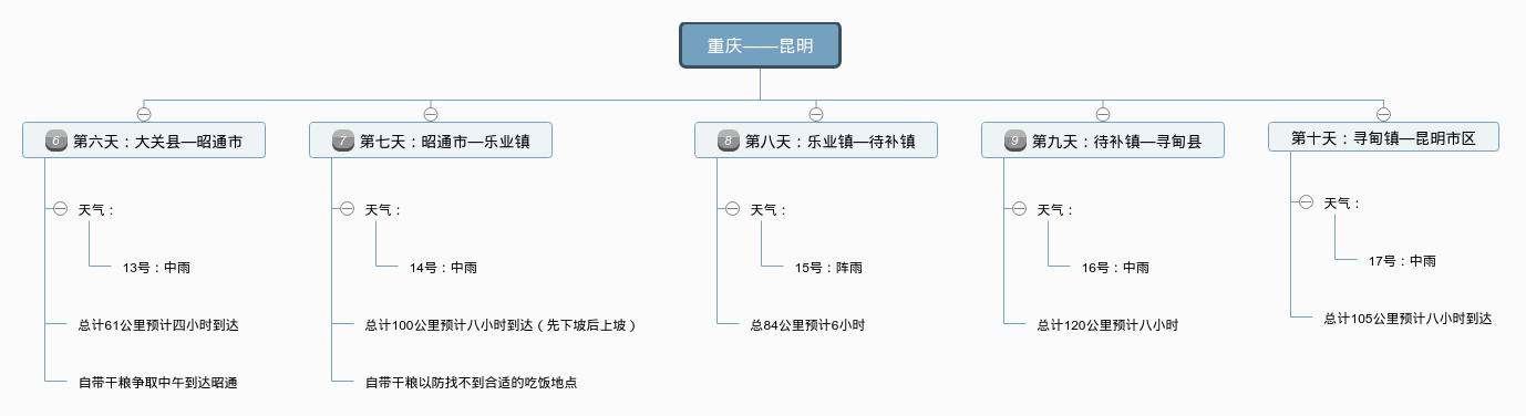 六月底正式离职了,计划了一次小长途骑行(重庆——昆明),定于七月八号出发,前半段路以多云为主,进入云南境内后天气预报多为中雨,希望预报不准,一路顺顺利利。