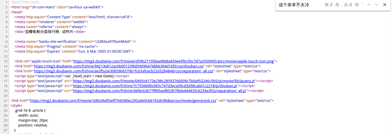 遇到这种情况初步就可以认定这个页面是采用AJAX异步加载的,你也可以通过右键查看网页源码来鉴别。比如说你右键查看源码ctrl+f搜索这个杀手不太冷这几个字,你会发现源码里没有。