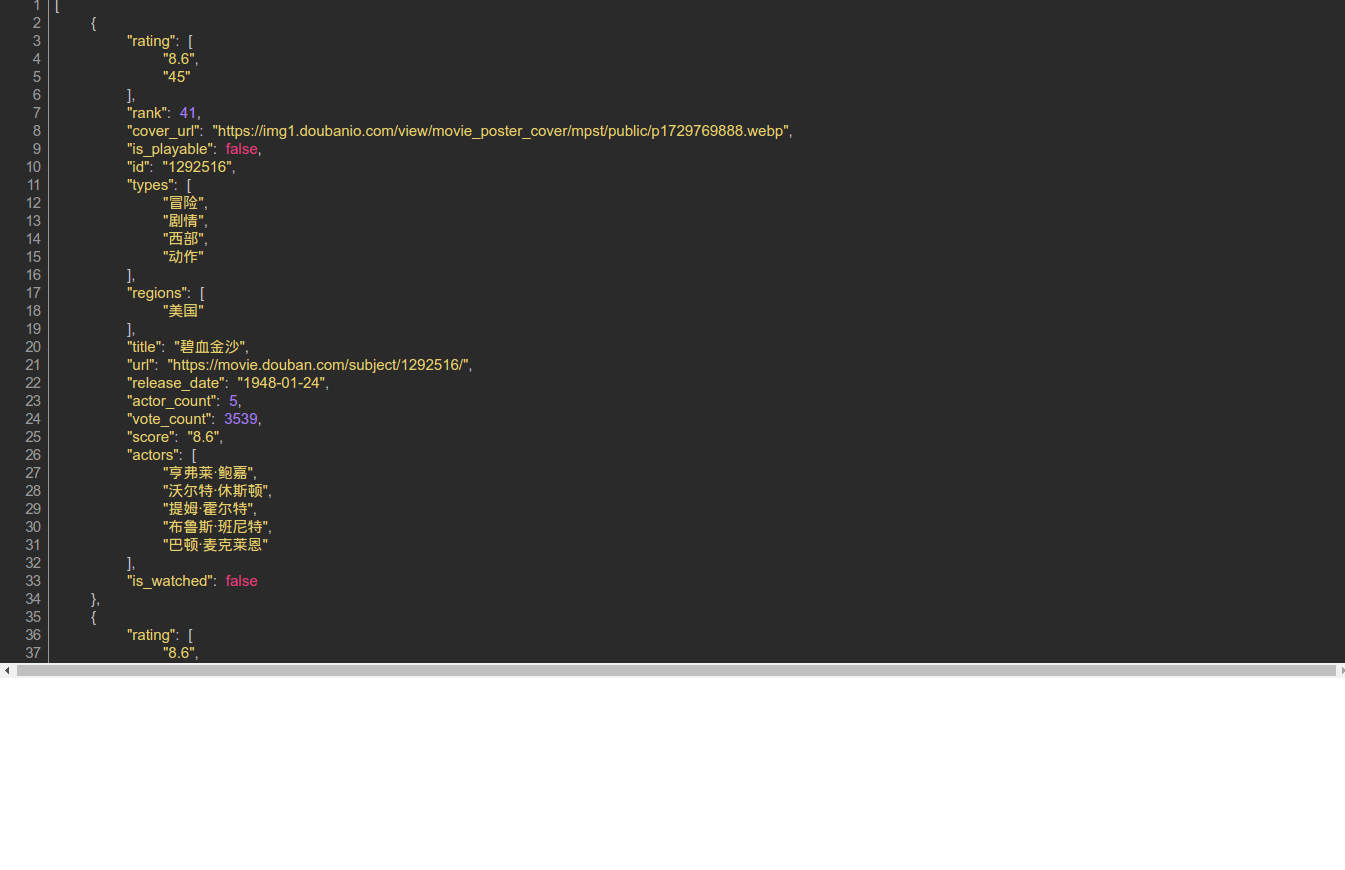 在Scrapy工程文件的spiders里写好爬虫文件后在settings.py所在的目录下打开终端运行以下代码就能输出相应的电影数据。