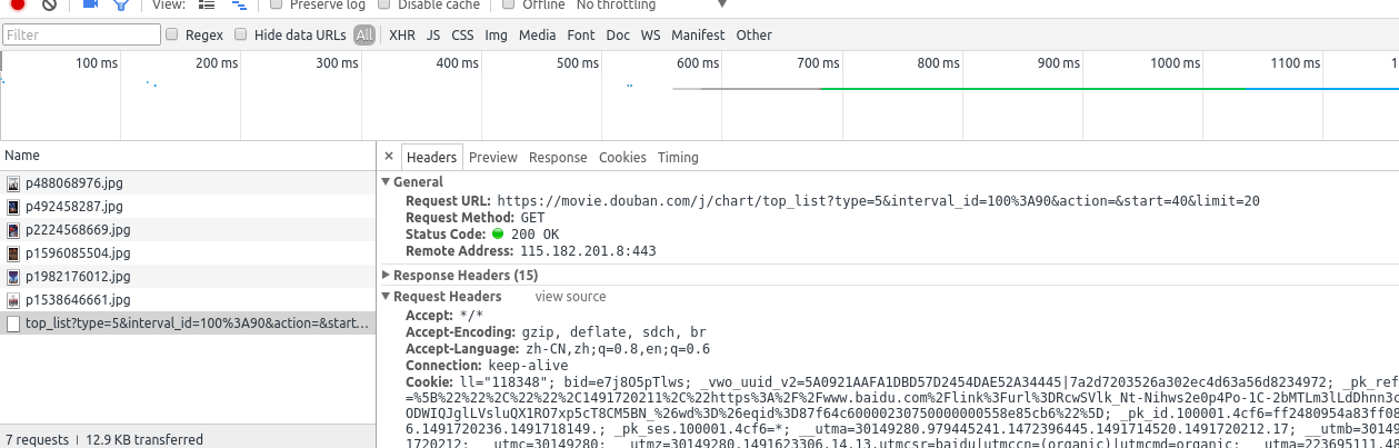 首先我们可以看出这是一个get请求,多看几个下拉请求的地址后你会发现地中的start=xxx在不断变化,每次增加20。所以我们只用更改这个参数就可以实现翻页不断获取新数据(修改其他的参数也会有不同的效果,这里就不一一细说了,留给大家慢慢地探索)。