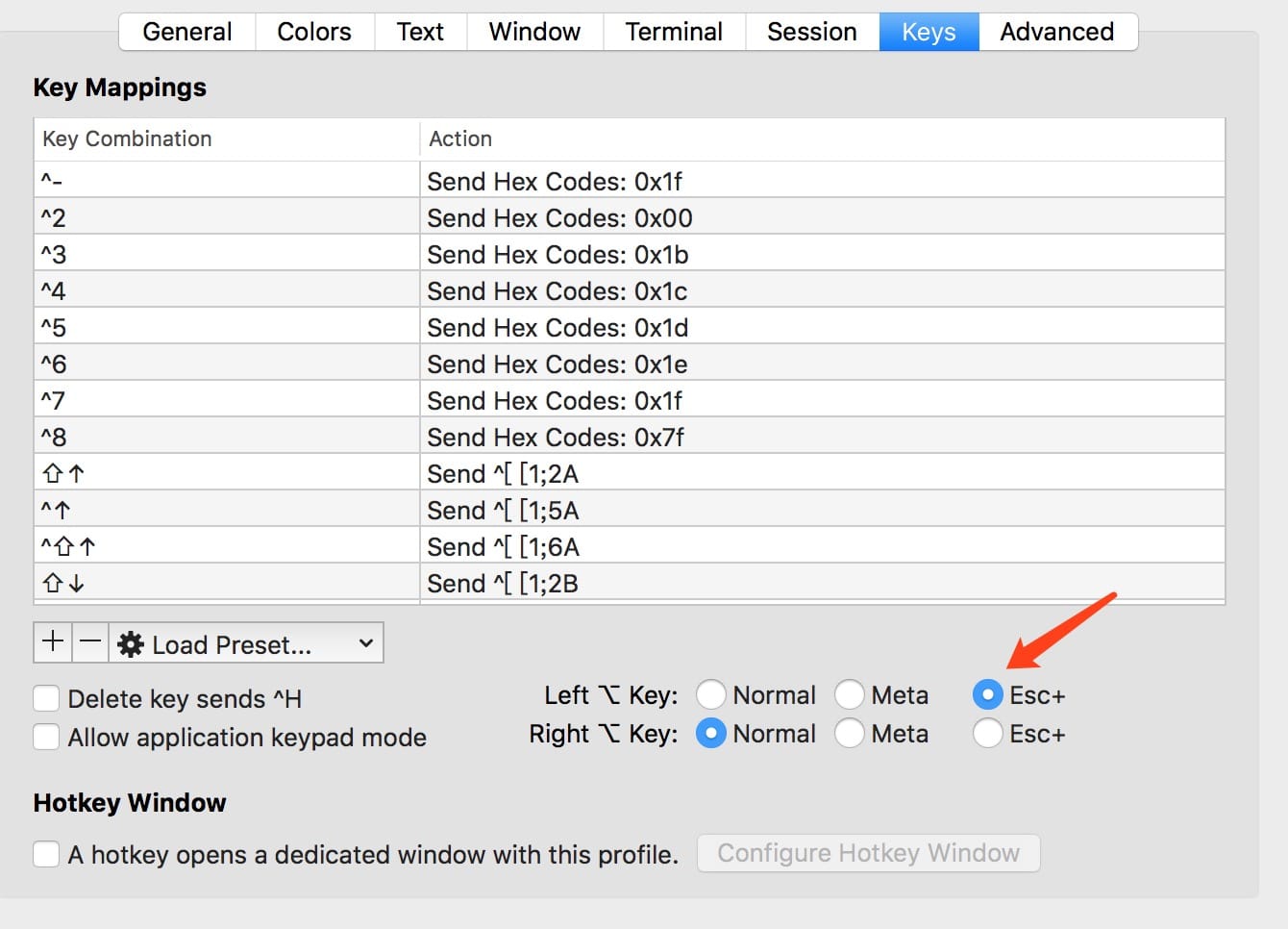 打开 Preferences > Profiles > Keys 按下图所示选择 Esc+: