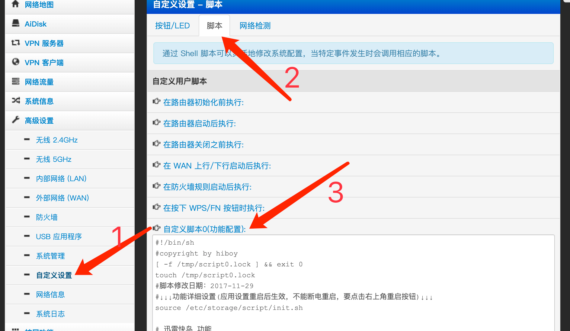 进入路由器后台,在自定义设置的脚本中选择自定义脚本加入下面命令并点击应用本页面设置: