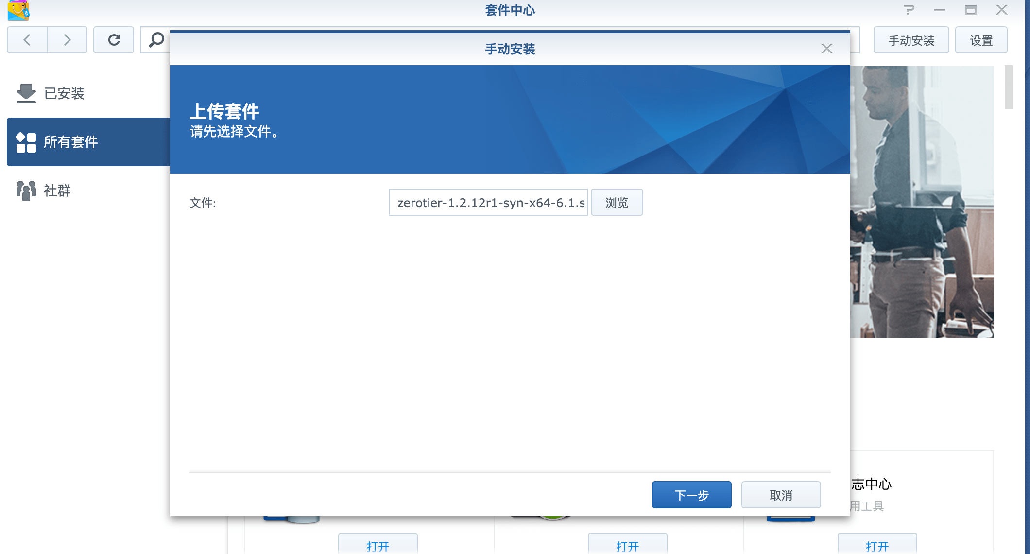 请根据自己的电脑 CPU 选择相应的安装包,蜗牛星际 C 款是:zerotier-1.2.12r1-syn-x64-6.1.spk