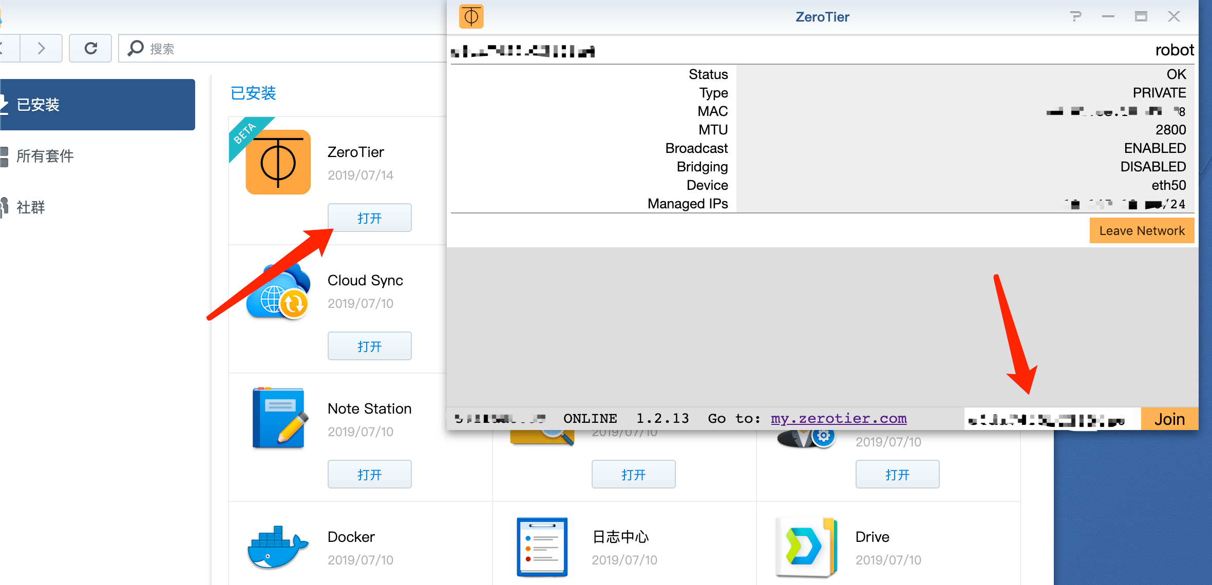 在套件中心打开安装好后的 ZeroTier,计入已经创建好的 ZeroTier 网络。ZeroTier 网络的创建请参考:P2P 内网穿透工具 ZeroTier
